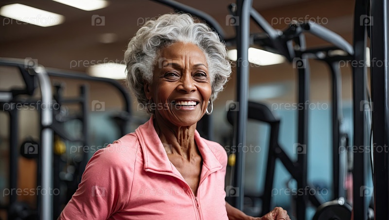 Улыбающаяся пожилая афроамериканская женщина, 70 лет, в розовом спортивном пиджаке, тренажерный зал, оздоровление, здоровье, активное старение, фитнес-портрет, реклама, промоушн