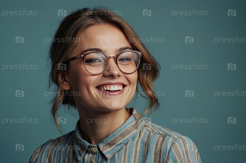 Кавказская девочка-подросток в модных очках, длинные слоистые волосы, полосатая колледжная рубашка, сине-серый фон.Коррекция астигматизма, формы и цветового акцента, образовательный проект веб графика кописфера