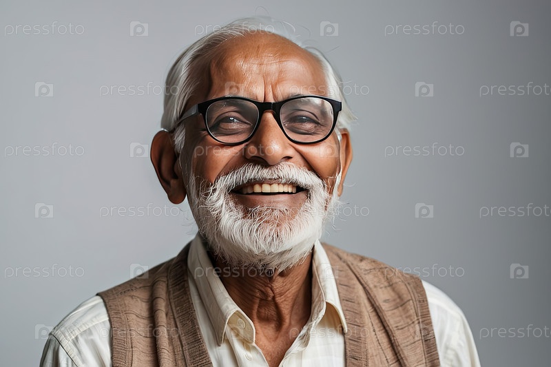 Улыбающийся пожилой индиец с очками, усами, традиционной одеждой, нейтральным фоном. проблема пресбиопии, комфортная рама, этнические кампании оздоровления, рекламные баннеры, блог по уходу за глазами