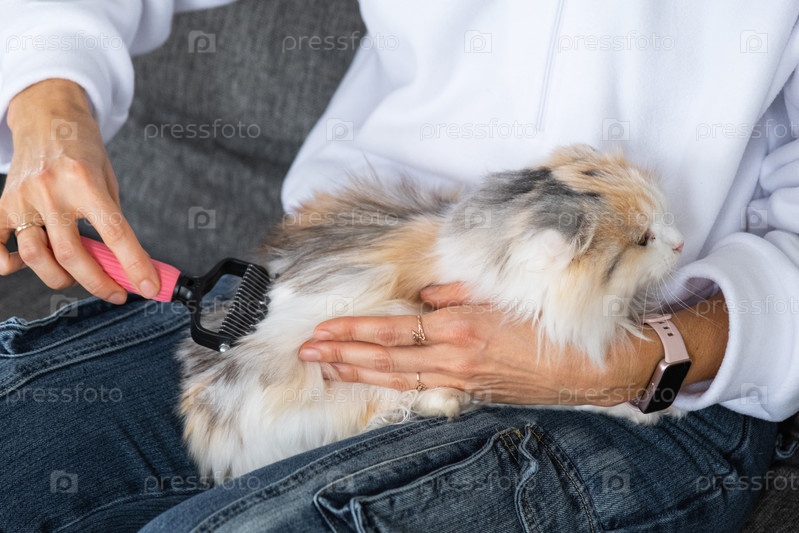 Женщина, ухаживающая за пушистой шотландской складкой, чистка длинных волос, уход, удаление запутанностей, нежная гигиена кошки, диван, домашняя рутина