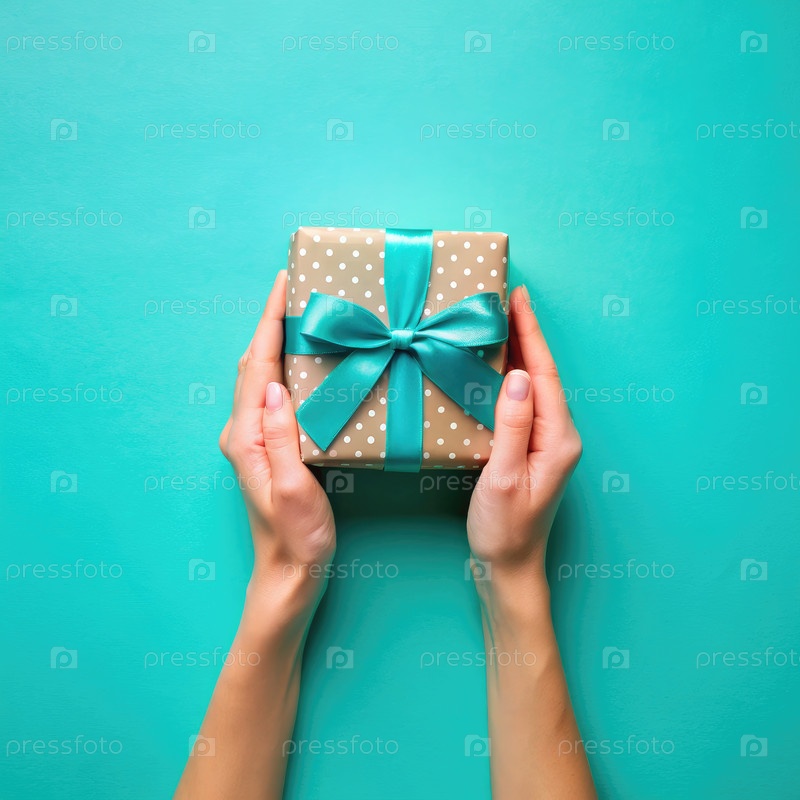 Руки, держащие подарочную коробку с зеленоватой ленточкой на бирюзовом фоне