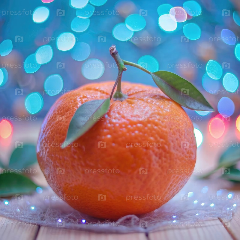 Одинокий мандарин оранжевый с зелеными листьями на фоне размытого синего и красного света