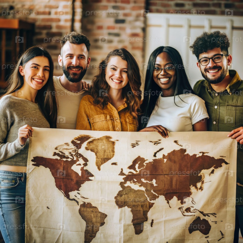 Баннер Международного дня дружбы с разнообразными друзьями, держащими карту мира. генеративный AI