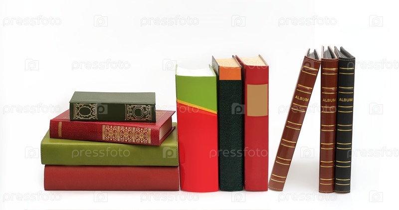 Куча книг в цветных обложках с белыми листами, изолированными на белом фоне