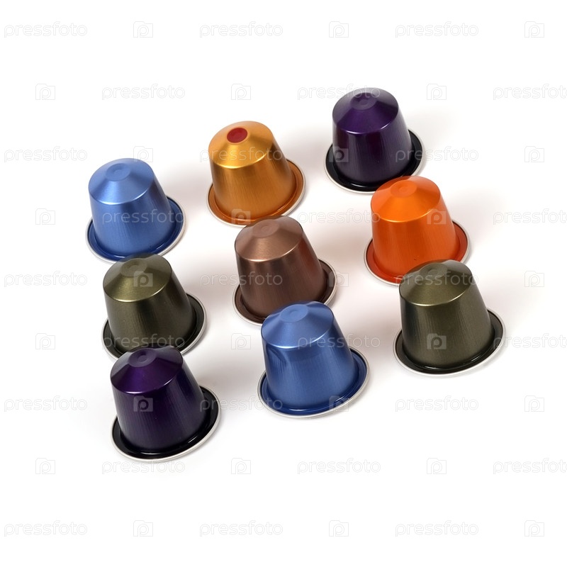 Многоцветные капсулы с крепким кофе под разными углами изолированы на белом фоне