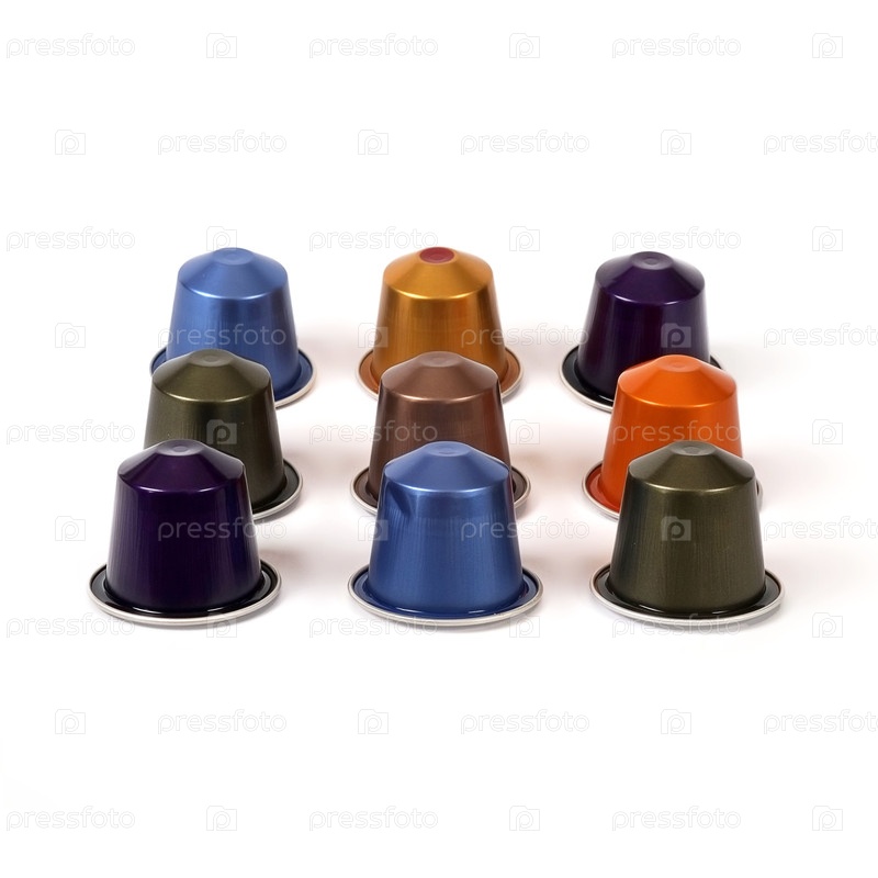Многоцветные капсулы с крепким кофе под разными углами изолированы на белом фоне