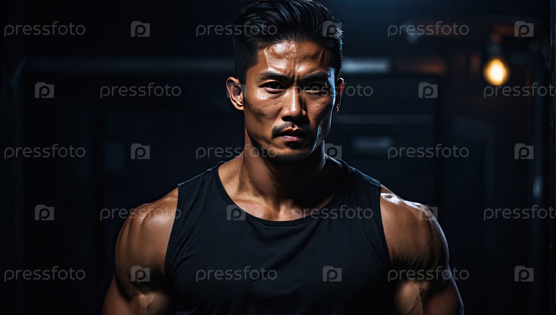 Азиатский спортсмен и фитнес-тренировщик сгибающие руки в тренажерном зале, мотивация, бодибилдинг, тренерство, активный образ жизни, фитнес клуб, рекламная зона