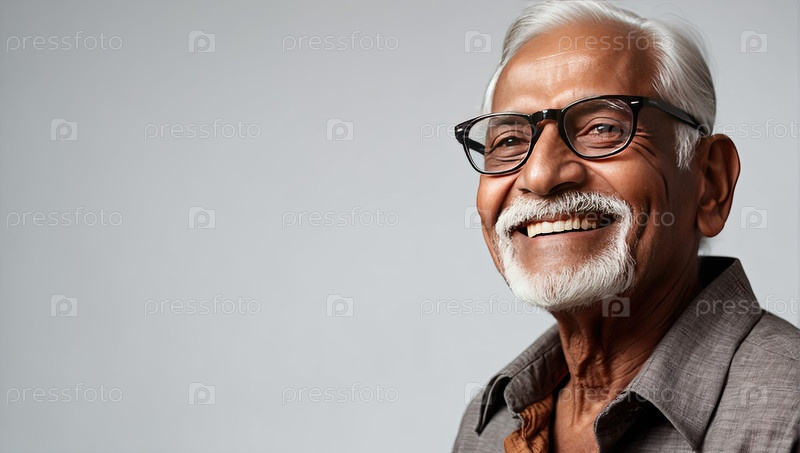 Пожилой мужчина в круглых очках и свитере-блейзе, веселая серая студия. усталость глаз, трудности со фокусировкой, модная рама, семейная клиника, дизайн гериатрических сайтов, веб-статья, копизона