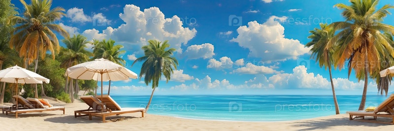 Ландшафтный пляж с зонтиками и креслами, веселый комфорт, оздоровление, яркая летняя реклама, много места для текста в открытом голубом небе