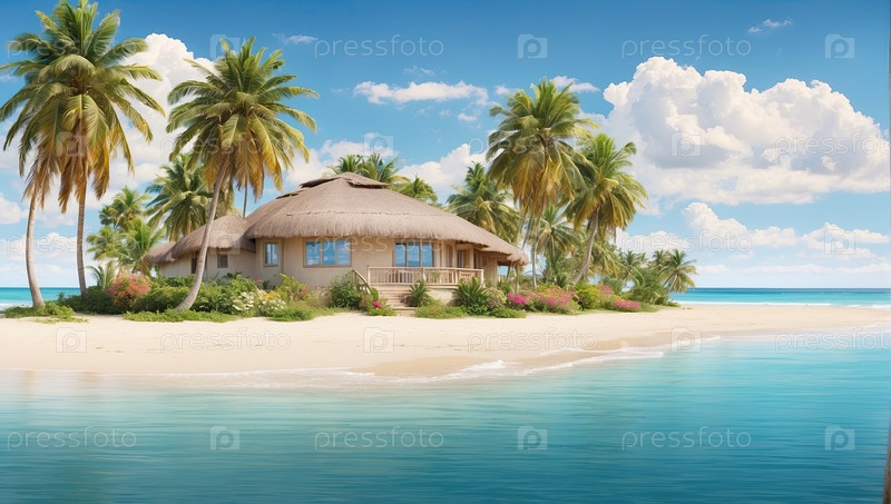 Приморский бунгало с тропическим садом, индивидуальный отель "все включено", семейный туризм, иллюстрация бронирования, стиль цифрового искусства