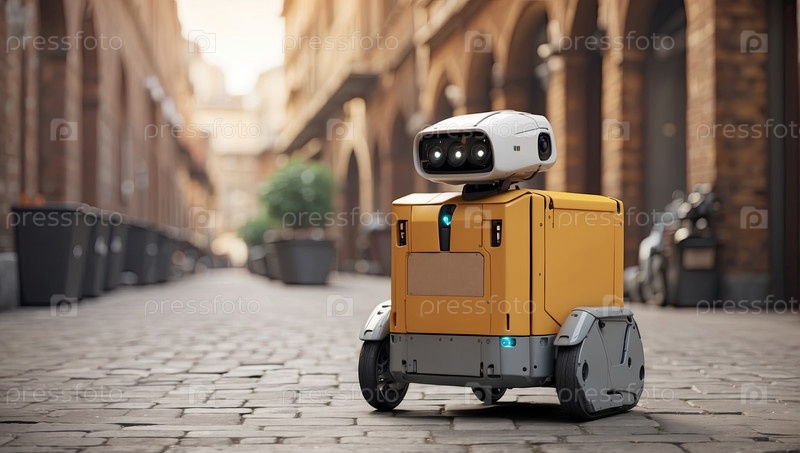 Автономный городской желтый робот доставки путешествует по тротуару города с посылкой для бесконтактной перевозки, инновационной курьерской технологией и логистикой последней мили