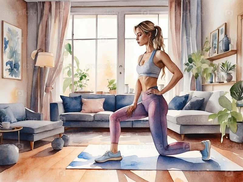 Илюстрация акварелью молодой женщины, занимающейся домашним фитнесом, упражнениями в современной гостиной, здоровье, благополучие, мотивация, идеально подходит для блогов, объявлений, сайтов оздоровления