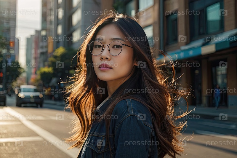 Азиатская девушка с волнистыми волосами, толстыми очками, голубой курткой, золотым городским светом. Трудно выбрать стиль рамы, проблемы со зрением, урбанистическая молодежная мода, визуально привлекательная для оптической рекламы или блога