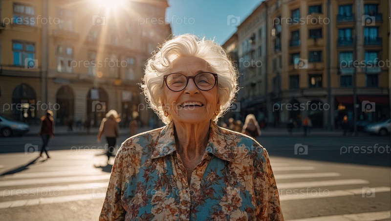 Старшая леди в больших овальных очках, высушенные седые волосы, городская площадь, дневный солнце, задумчивая. макулярная дегенерация, пресбиопия, искажение зрения, сайт информирования общественности, онлайн-ресурс школьной медиа