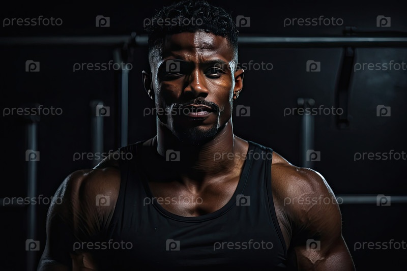 Афроамериканский спортсмен-мужчина, фитнес-тренировщик, тренер по тренажерам, профессиональный персонал, спортивная одежда, сильные, бодибилдинг, оздоровление, текстовая область, рекламное изображение