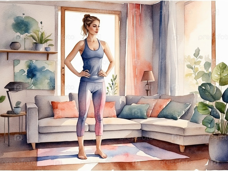 Акварельная иллюстрация домашнего фитнеса, молодая женщина в спортивной одежде занимается в уютной квартире, вдохновение для здорового образа жизни, полезное для блогов, рекламы, приложений