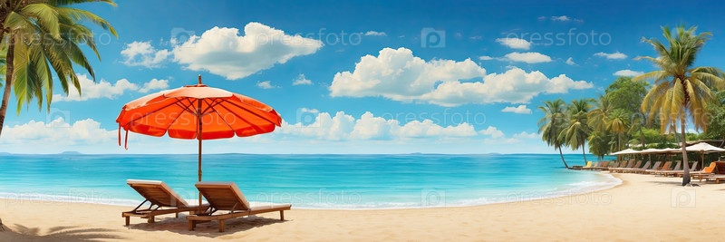 Пляжная сцена с шезлонгами и зонтиками, реклама агентства, солнцезащита, бронирование, беззаботные каникулы, профилактика ожогов