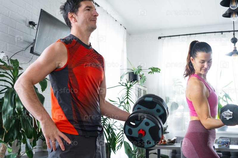 Пара после фитнес-тренировки, современный дом, дружелюбная спортивная атмосфера, взаимное здравоохранение, релаксация, комнатные растения, повседневная домашняя одежда, физические упражнения в качестве хобби
