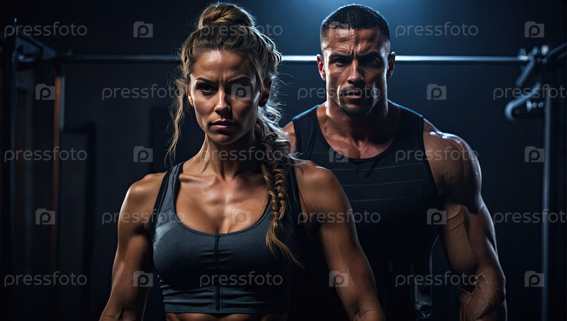 Кавказские мужчины и женщины спортивные тренеры, команда тренажерного клуба, фитнес-персонал, энергичный, личные тренеры, здоровый образ жизни, использование рекламы, реклама, место для текста
