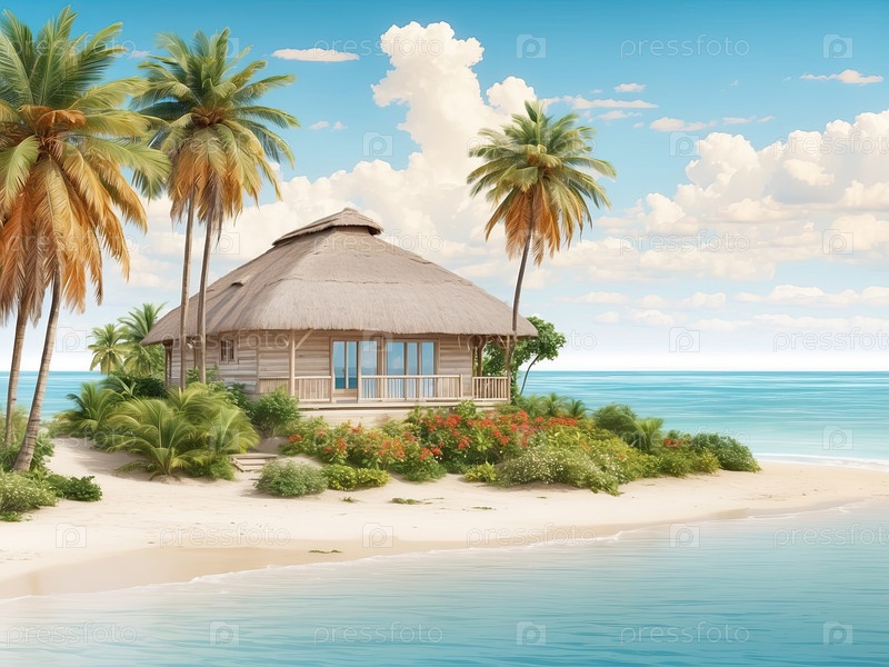 Береговое бунгало под пальмой у тихой лагуны, частный курорт с комплексом "все включено", семейные каникулы, цифровые иллюстрации из мультфильмов