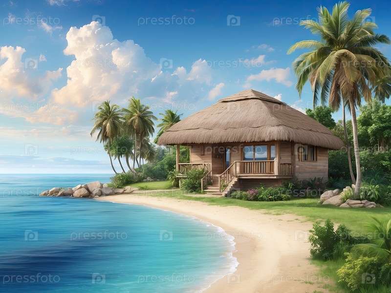 Тропическая набережная вилла с пальмой, частный летний отдых "все включено", райское убежище, гостеприимство, цифровая иллюстрация мультфильмов