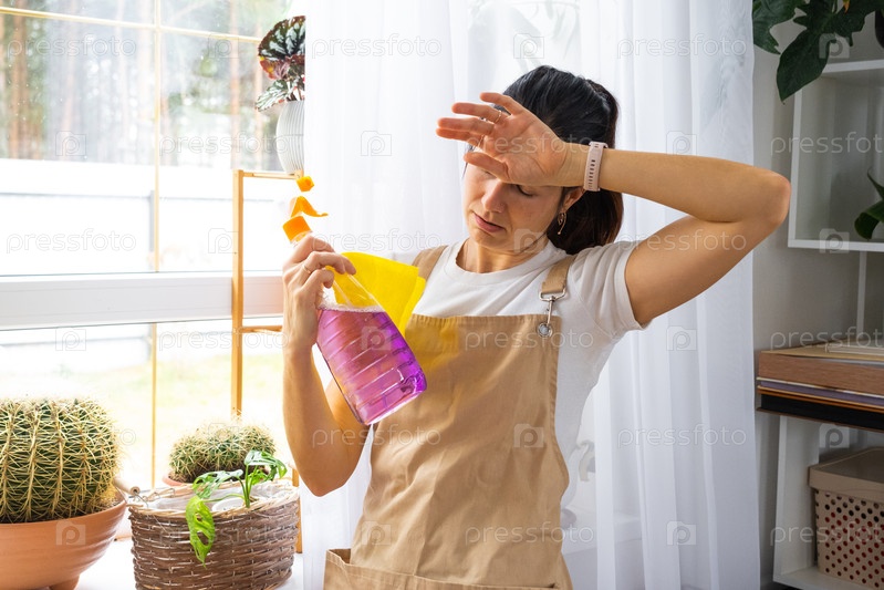 Женщина с чистящими средствами, рука на голове, усталость от ухода за весенними окнами, оранжевые перчатки, эмоции, нуждается в услугах по уборке, объявление для клинингового бизнеса