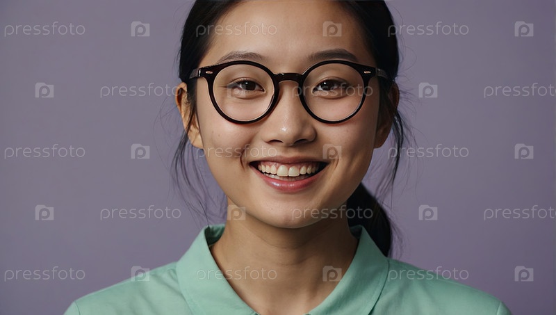 Улыбающаяся азиатская девушка в круглых очках, мятная футболка, фиолетовый студийный фон.Проблема коррекции, подборки рамы, руководство по молодежному стилю, приложения, образовательные карточки, место для копирования