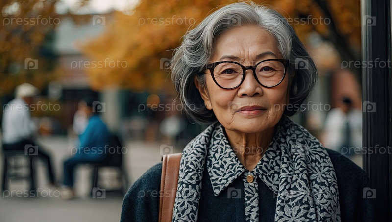 Пожилая азиатская женщина с волосами средней длины, классические очки, шарф, осенний парк. диабетическая ретинопатия, глаукома, пресбиопия в возрасте, комфорт рамы, колонка здоровья осени, плакат осведомленности, пустое место для информации