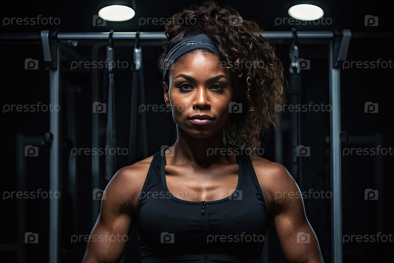 Афроамериканская женская фитнес-тренера, профессиональный спортзал, атлетика, личный тренер, персонал оздоровления, портрет, спортивная одежда, реклама, область сообщений