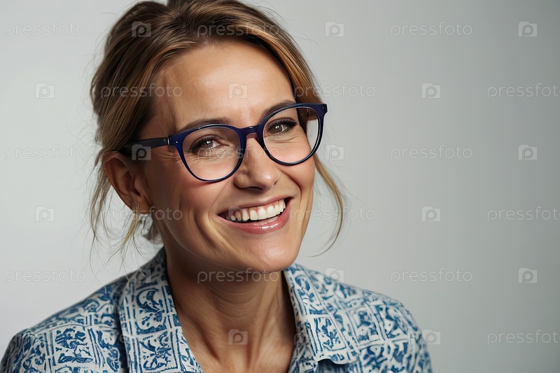 Элегантная старшая белая женщина в очках, стильный бутерброд, синяя блузка, спокойная улыбка, студия, простой фон. потеря зрения, выбор объектива, поддержка зрения, уверенность, комфорт, пространство для текста
