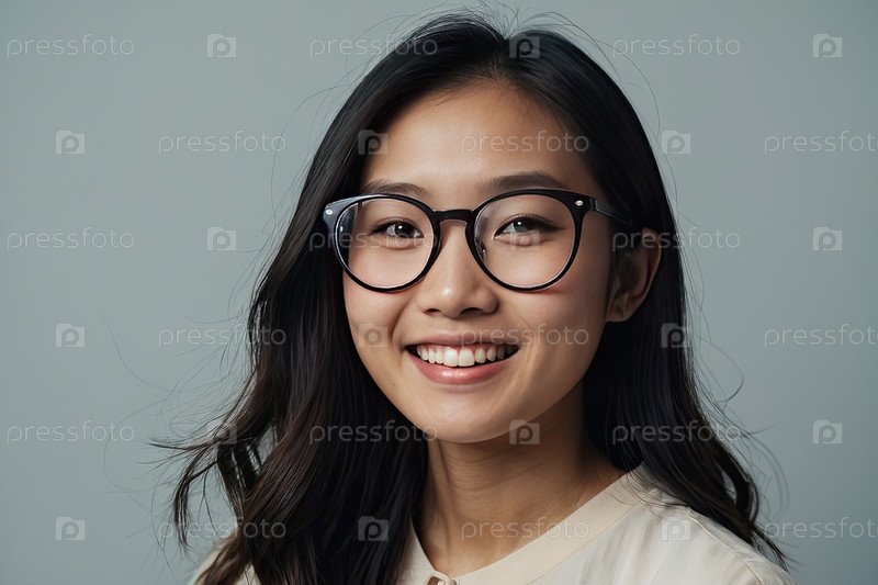 Красивая азиатская женщина в больших круглых очках, открытые волосы, яркая студия, радостное выражение. борется со зрением, находит подходящую раму, стильный аксессуар, полезен для блогов, услуг, веб-рекламы