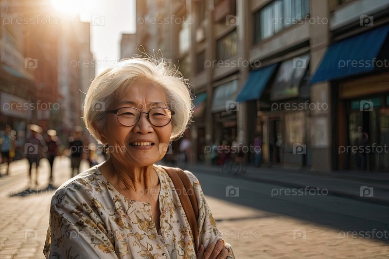 Пожилая дама в изящном кардигане, световые очки, день сияющего города. пресбиопия, диабетическая ретинопатия, проблема комфорта, адвокация пожилых людей, блог о помощи гериатрии, зона внимания на открытом воздухе для информации о здоровье