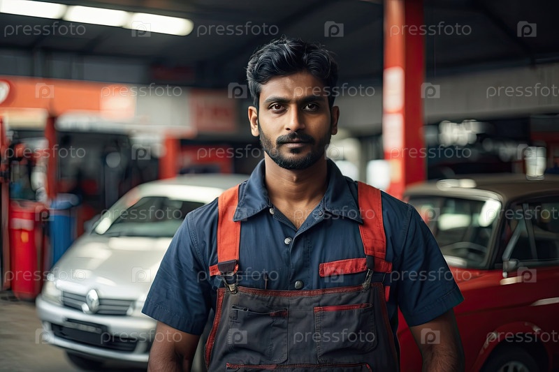 Портрет южноазиатского мужчины-автомеханика с бородой в синей и серой форме на современной автомастерской, профессионал, уверенность, персонал, сервис, имеет текстовую область