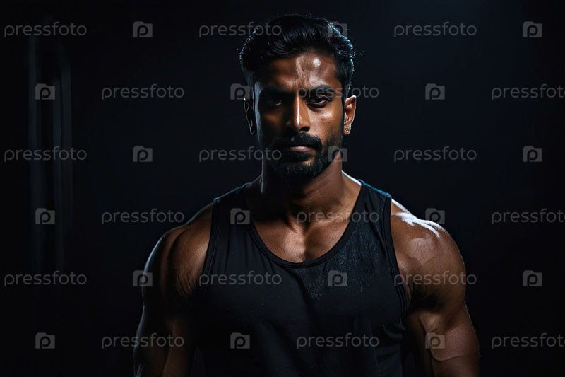 Индийский мужской фитнес-тренировщик в тренажерном зале, мускулистый спортсмен в спортивной одежде, личный тренер, фитнес-клуб, сила, мотивация, текстовое пространство, реклама, персонал клуба