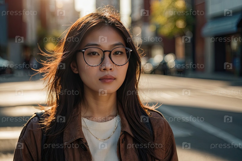 Молодая азиатская женщина в больших очках, бледно-розовая помада, винтажный городской внешний вид, творческий городской фон. Дискомфорт зрения, барьер типа рамы, современная мода, подходит для блога, сообщения о здравоохранении