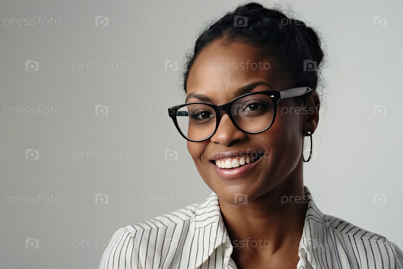 Красивая афроамериканская женщина в очках, улыбающаяся, полосатая блузка, студия, нейтральный фон