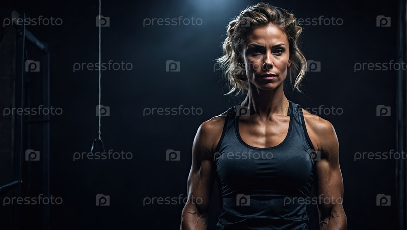 Кавказская женщина-фитнес-тренера в тренажерном зале, атлетическая женщина, личный тренер, портрет силы, фитнес-клуб, спортивная одежда, мотивация, копировальное пространство, реклама