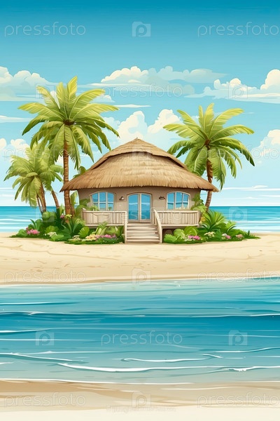 Бунгало на пляже голубой лагуны, проживание с комплексом "все включено", личный тропический отдых, эксклюзивная курортная вилла, цифровая иллюстрация, стиль мультфильм