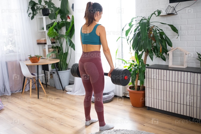 Женщина практикует фитнес дома, спортивная одежда, домашняя тренировка, современный легкий интерьер, гантели, здоровый образ жизни, тренажерный зал в доме, самообслуживание