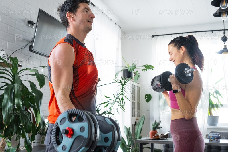 Мужчина и женщина мотивируют друг друга, домашний фитнес, современный активный дом, спортивная одежда, рутина тренировок на гантеле, зеленый декор растений, семейное благополучие