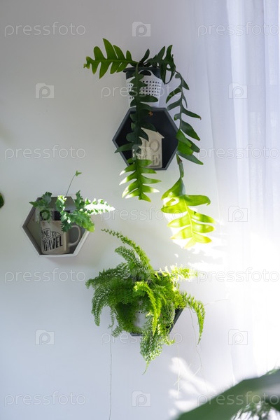 Небольшая группа растений, минимальные плавучие горшки, солнечный свет на белой стене, окно, экологическое настроение, современный стиль, ссылка на дизайн интерьера, визуальные эффекты сайта