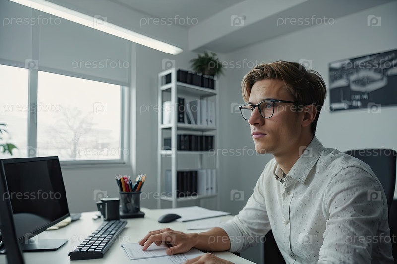 Молодой офисный работник в очках на чистом рабочем месте, работающий с ноутбуком, коррекция зрения, очки, цифровое консультирование, здоровая эффективность, производительность бизнеса