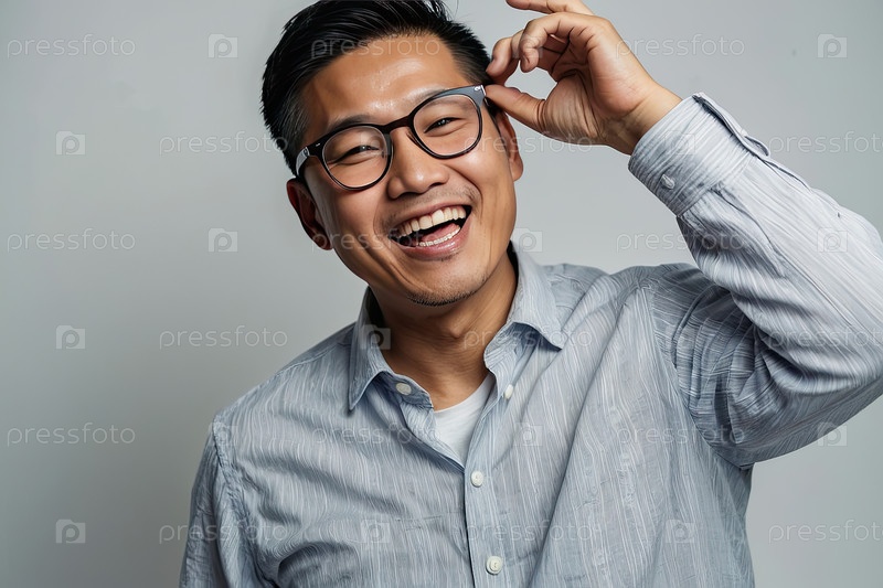 Взрослый азиатский мужчина в очках, поднятая рука, большая улыбка, студия, светлый фон, проблемы со зрением, поиск очков, положительное настроение, копирайтинг