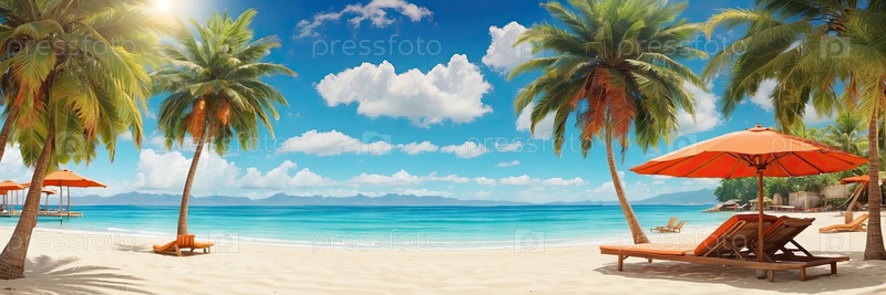 Широкий баннер пляжа с зонтиками, песком и морем, летний отдых, оздоровление и комфорт, большая область заголовка для маркетингового сообщения