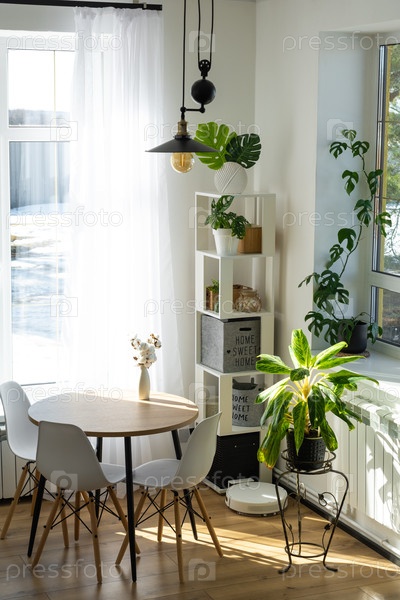 Пищевая зона с растениями, дневной свет, большие окна, естественный свет, минимализм, спокойствие, зелень в горшке, нейтральный цвет, дизайн fit-out, списки недвижимости