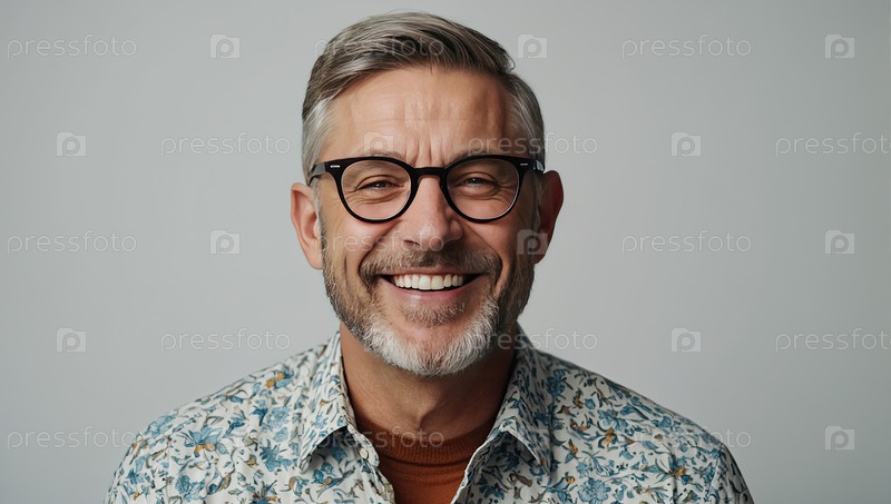 Улыбающийся белый мужчина средних лет в очках, борода, рубашка с повседневной печатью, студия, радостное настроение, проблемы с выбором очков, слабое зрение, копирасположение, простой фон
