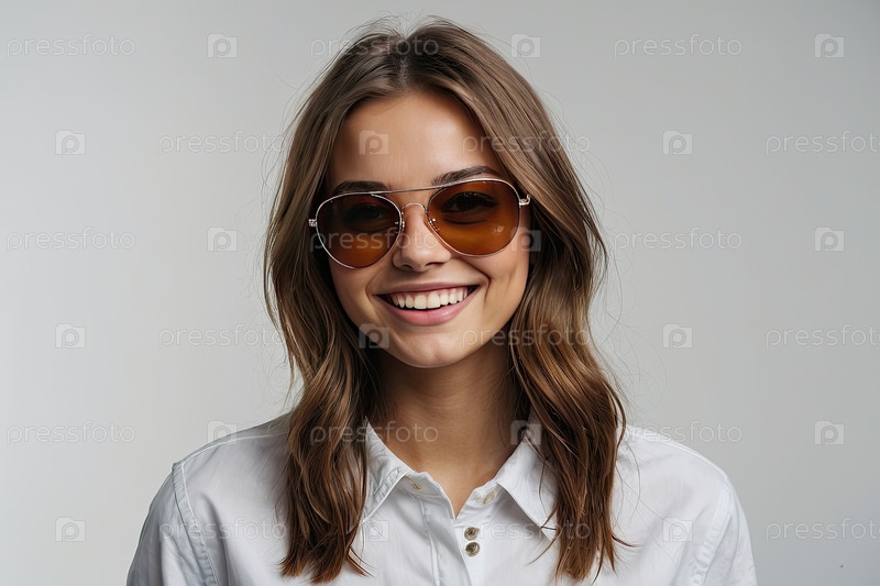 Кавказская девушка-подросток в очках коричневого оттенка, волосы средней длины, белая пуговица, яркая улыбка. стильный тренд для коррекции глаз, городская мода, рекламный баннер, молодежный бренд, визуальный социальные сети