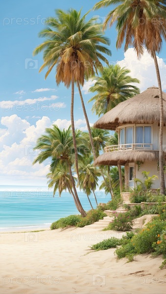Уютный тропический бунгало на берегу белого песка и голубого моря, эксклюзивная частная аренда, все включенное жилье на острове, иллюстрация цифрового искусства