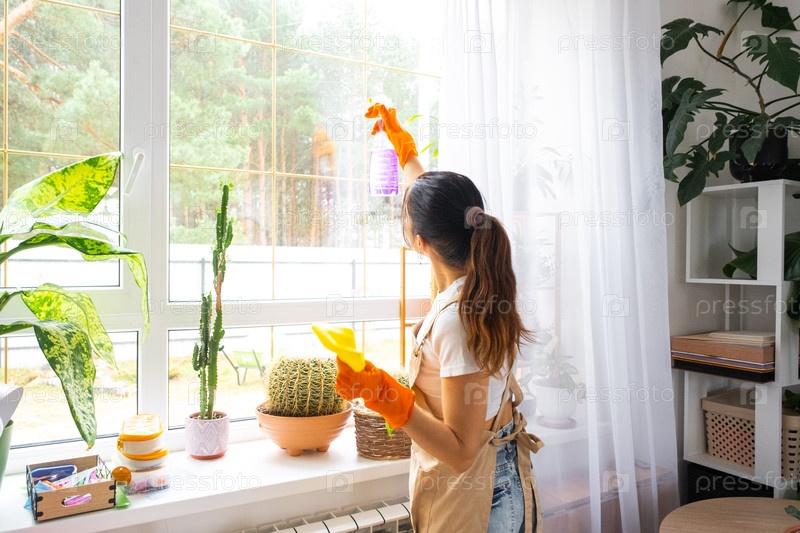 Молодая женщина моет окно, оранжевые перчатки, сервис в уборной промышленности, современная квартира, очистный спрей, деловое предложение, рутина мытья стекла
