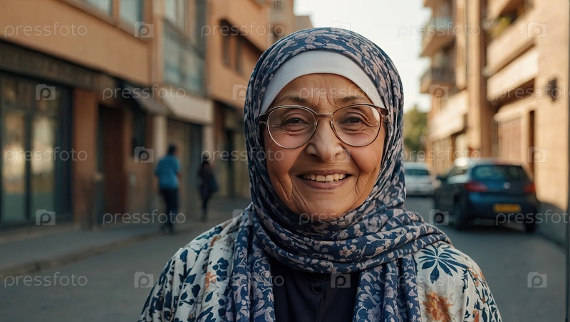 Пожилая арабская женщина в городской среде улыбается в хиджабе и очках с пространством для текста, очков и ухода за зрением, концепция здорового старения, профессиональный портрет